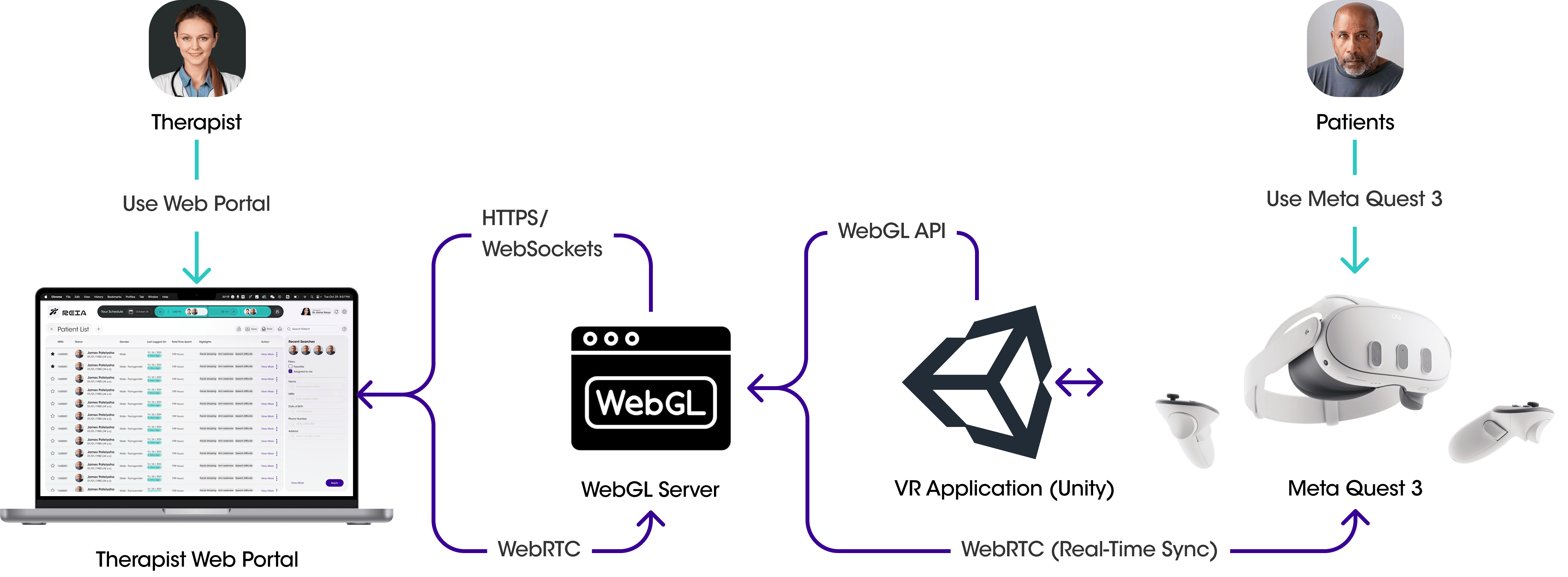 This system design enables real-time, synchronized interaction between clinicians and patients by connecting a web-based portal with a mixed reality rehabilitation experience on Meta Quest 3, leveraging WebGL, WebRTC, and Unity for seamless communication and spatial visualization.