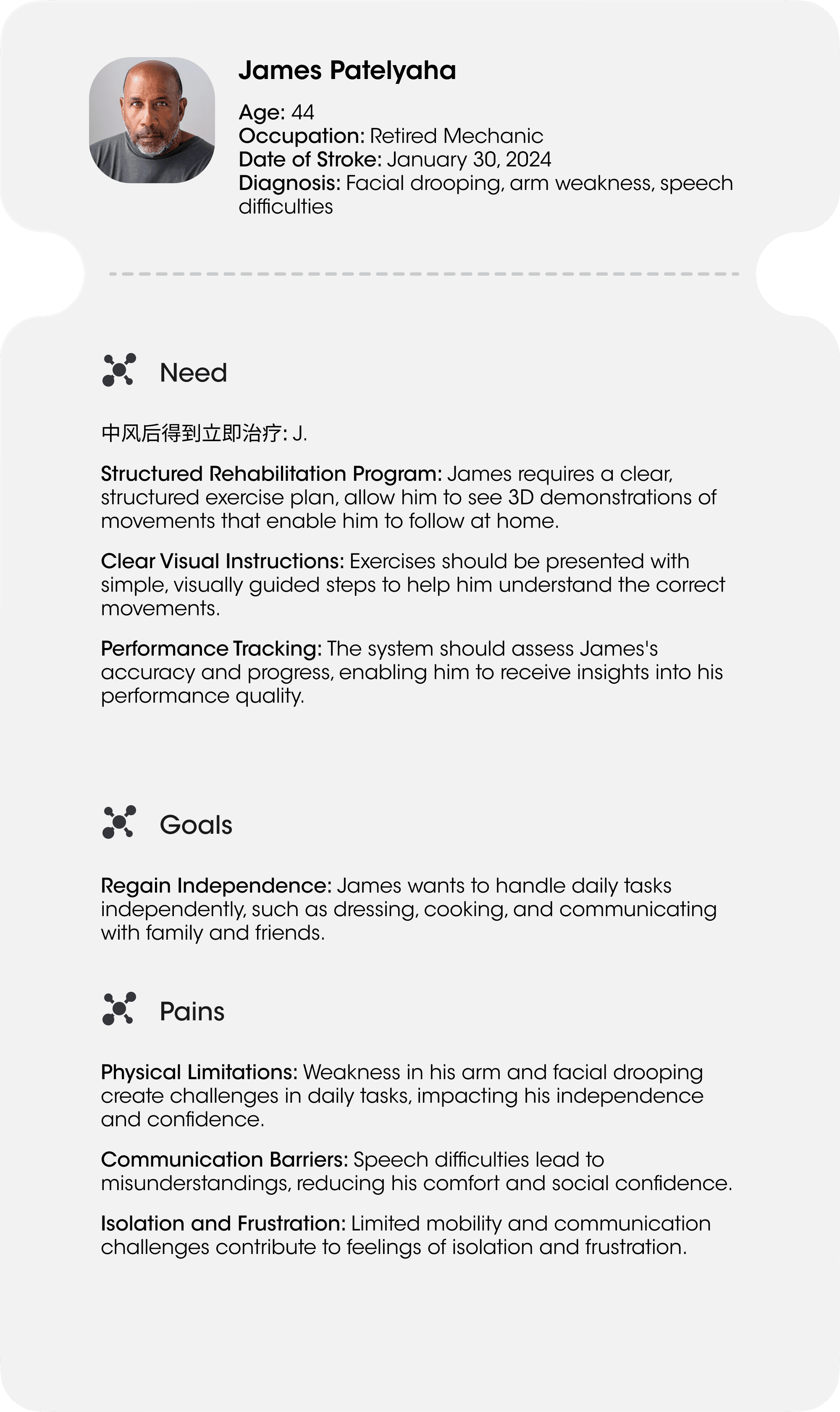 "This project is deeply personal to me. My grandfather suffered a severe stroke and lived with disability for seven years before he passed away. I witnessed firsthand how difficult and isolating recovery can be — not only for patients, but for their families too."