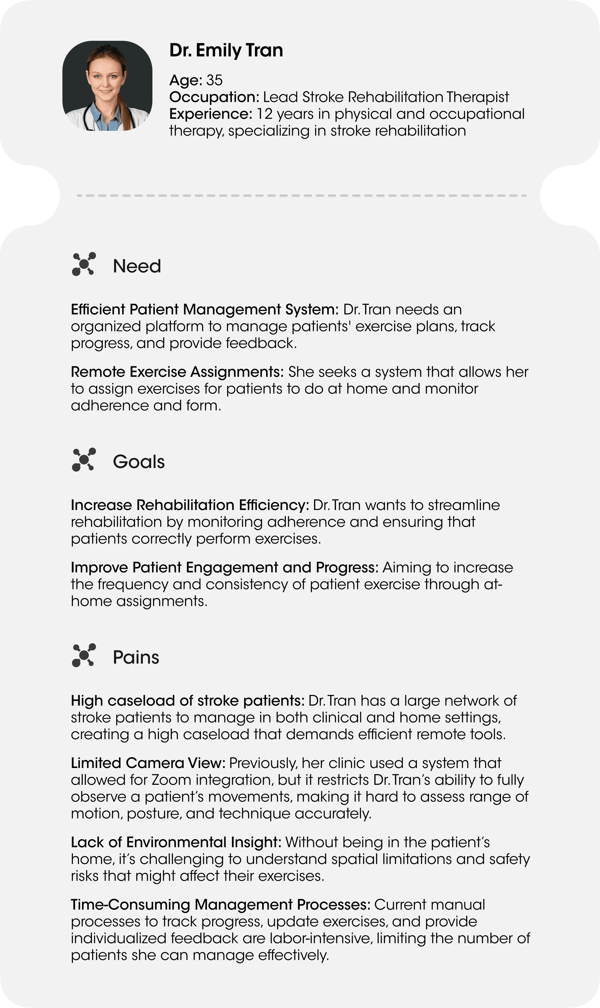 Our team conducted user interviews with 50+ post-stroke patients as well as UCSF and Stanford stroke clinicians.